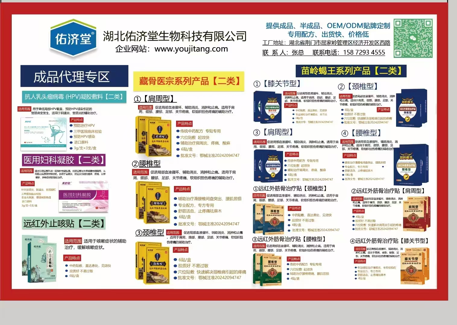 湖北佑济堂是械字号膏药代加工、膏药贴牌的厂家,我们提供的膏药种类多,且合作方式多样化。自营产品全国范围内招商代理,可承接械字号膏药贴牌定制。